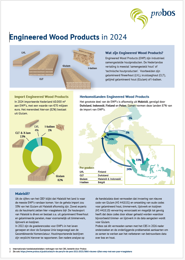 Een aansprekende infographic over de import, herkomstlanden, het verbruik en de toepassing van engineered wood products (EWP) in 2024.