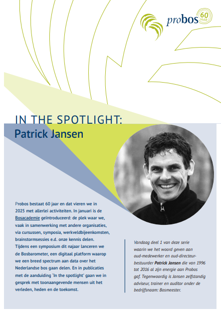 Met Spotlightpublicaties zetten we toonaangevende mensen uit het verleden, heden en de toekomst van Probos in het licht. In deze uitgave: oud-directeur en bestuurder Patrick Jansen met een terugblik op 20 enerverende Probosjaren.