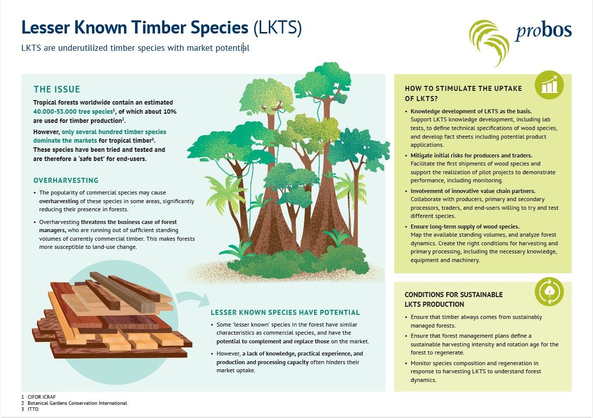 Lesser Known Timber Species (LKTS) are underutilized timber species with market potential. LKTS are becoming more important to forest managers each year, because the harvesting of only a limited amount of ‘commercial species’ causes overharvesting in some regions, reducing species’ abundance. This is already a serious threat to the business case of sustainable forest management for some forest managers. Bringing LKTS to market can be risky, but can also be a business opportunity for both forest managers and timber traders.