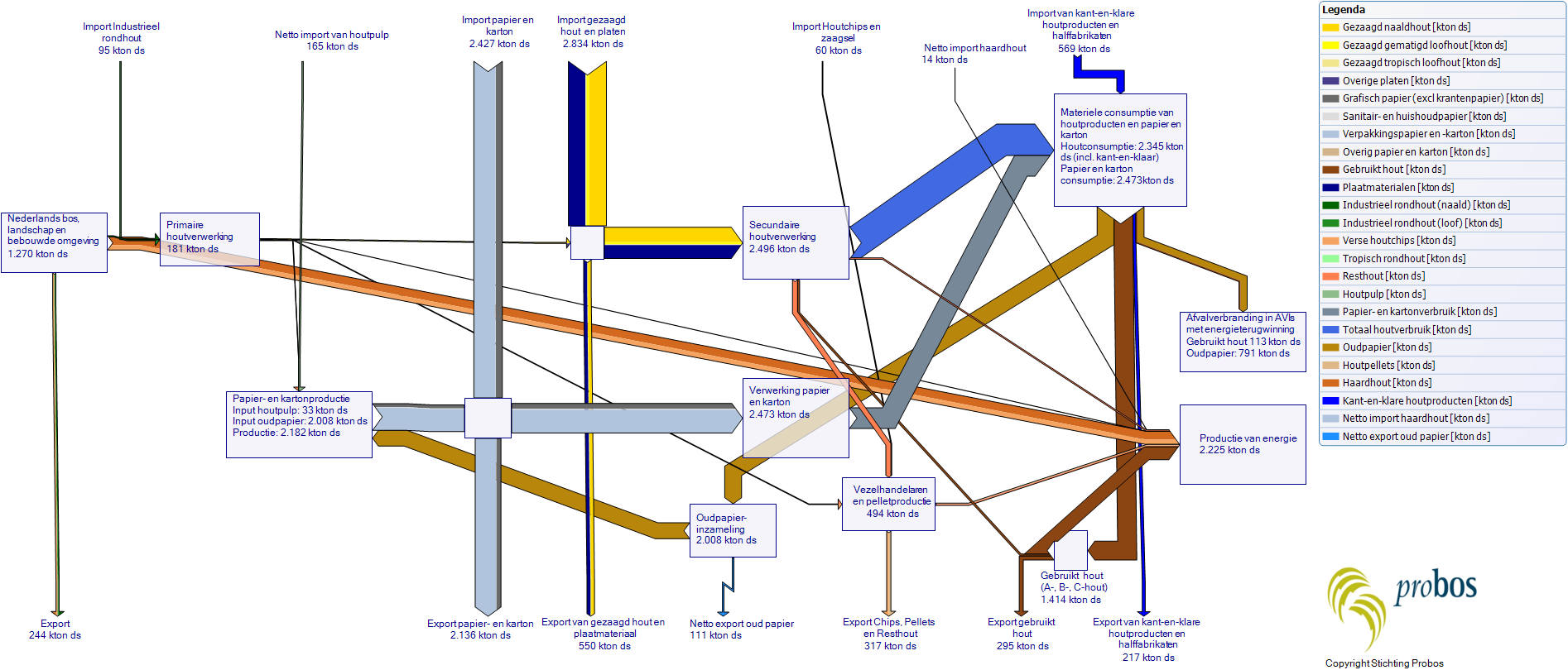Een stroomschema dat de gehele Nederlandse houtketen weergeeft in kton droge stof in 2024.